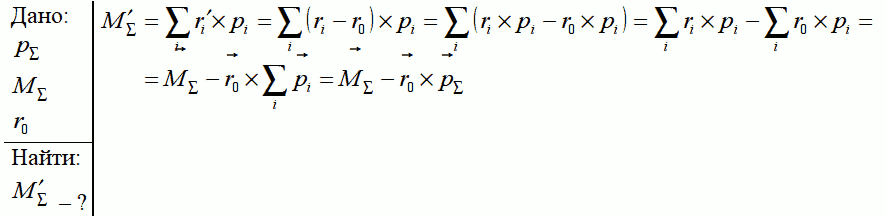 Условие задачи:Некоторая система частиц имеет суммарный импульс p и момент импульса M относительно точки O. Найти ее момент импульса M' относительно точки O', положение которой по отношению к точке O определяется радиус-вектором r0. Выяснить, в каком случае момент импульса системы частиц не будет зависеть от выбора точки O.