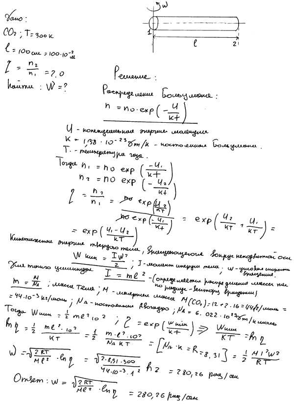 Условие задачи:Горизонтально расположенную трубку с закрытыми торцами вращают с постоянной угловой скоростью ω вокруг вертикальной оси, проходящей через один из ее торцов. В трубке находится углекислый газ при температуре Т = 300 К. Длина трубки l = 100 см. Найти значение ω, при котором отношение концентраций молекул у противоположных, торцов трубки η = 2,0.