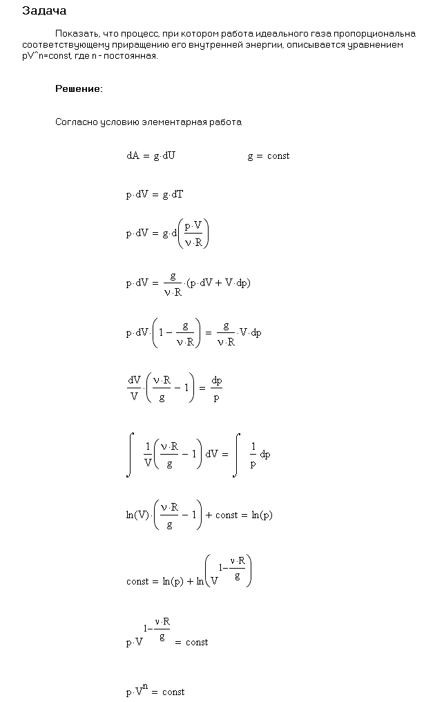 Условие задачи:Показать, что процесс, при котором работа идеального газа пропорциональна соответствующему приращению его внутренней энергии, описывается уравнением pVn = const, где n — постоянная.