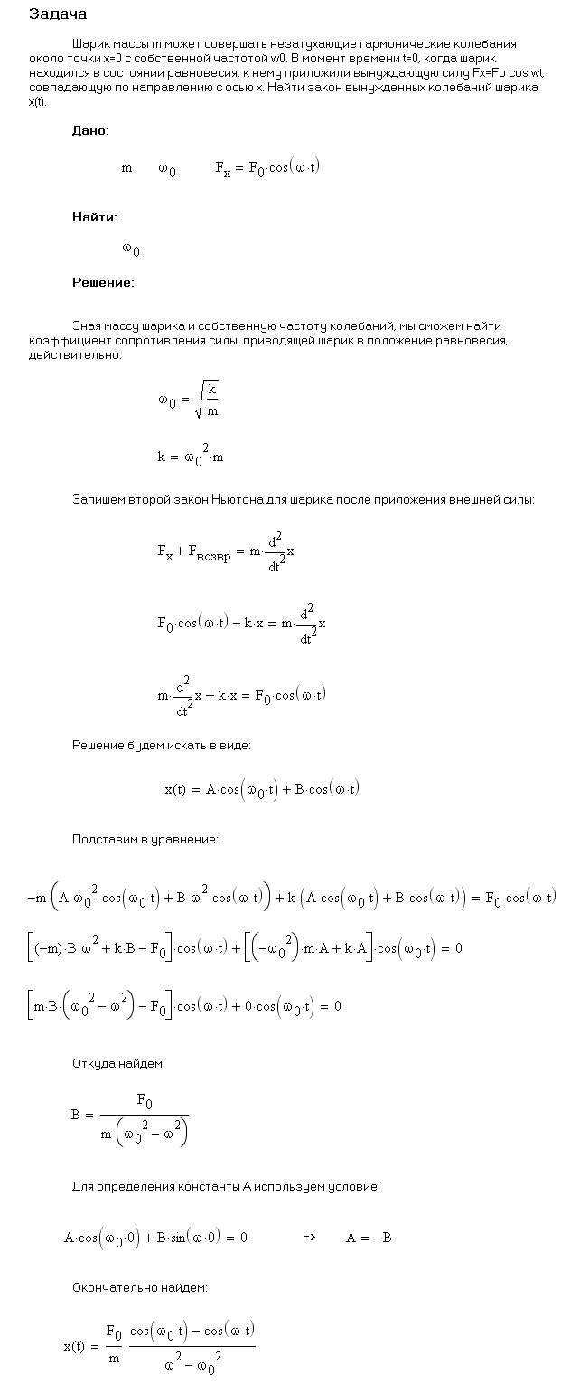 Условие задачи:Шарик массы m может совершать незатухающие гармонические колебания около точки x = 0 с собственной частотой ω0. В момент t = 0, когда шарик находился в состоянии равновесия, к нему приложили вынуждающую силу F = F0 cos ωt, совпадающую по направлению с осью x. Найти уравнение вынужденных колебаний шарика х (t).