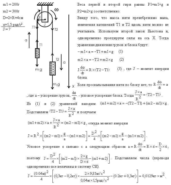 Условие задачи:Нить с привязанными к ее концам грузами массами m1=50 г и m2=60 г перекинута через блок диаметром D=4 см. Определить момент инерции J блока, если под действием силы тяжести грузов он получил угловое ускорение ε=1,5 рад/с2. Трением и проскальзыванием нити по блоку пренебречь.