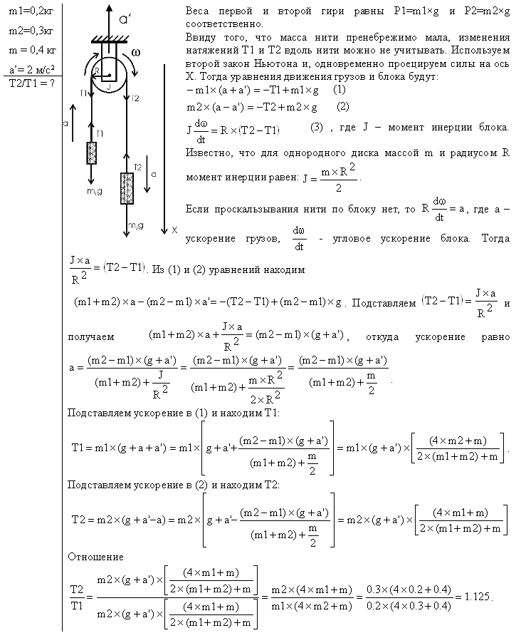 К концам легкой и нерастяжимой нити, перекинутой через блок, подвешены грузы массами m1=0,2 кг и m2=0,3 кг. Во сколько раз отличаются силы, действующие на нить по обе стороны от блока, если масса блока m=0,4 кг, а его ось движется вертикально вверх с ускорением а=2 м/с2? Силами трения и проскальзывания нити по блоку пренебречь.