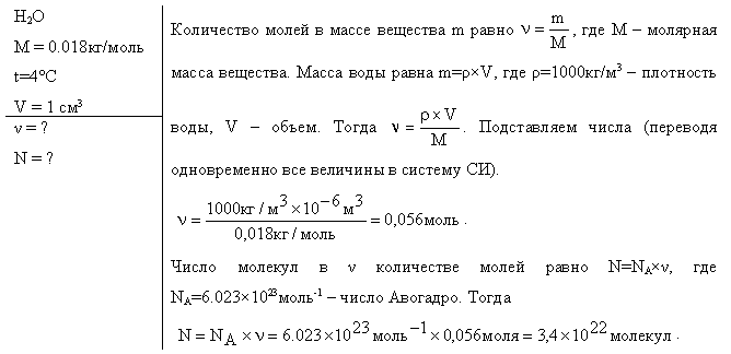 Условие задачи:Вода при температуре t=4° C занимает объем V=1 см3. Определить количество вещества ν и число N молекул воды.
