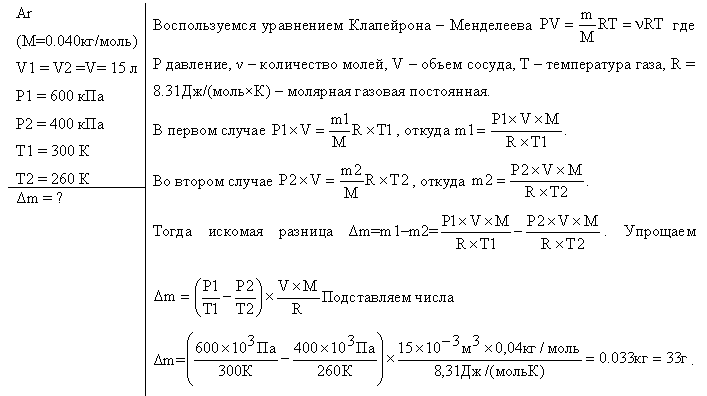 Условие задачи:В баллоне вместимостью V=15 л находится аргон под давлением p1=600 кПа и при температуре Т1=300 К. Когда из баллона было взято некоторое количество газа, давление в баллоне понизилось до p2=400 кПа, а температура установилась T2=260 К. Определить массу m аргона, взятого из баллона.
