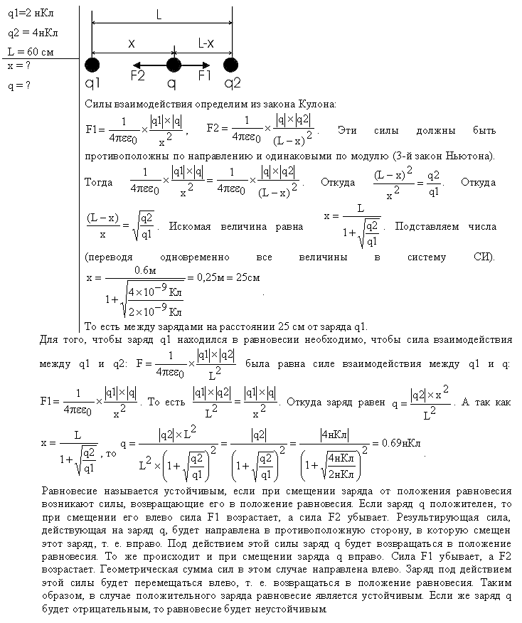 Условие задачи:Расстояние L между двумя точечными зарядами Q1=2 нКл и Q2=4 нКл равно 60 см. Определить точку, в которую нужно поместить третий заряд Q3 так, чтобы система зарядов находилась в равновесии. Определить заряд Q3 и его знак. Устойчивое или неустойчивое будет равновесие?
