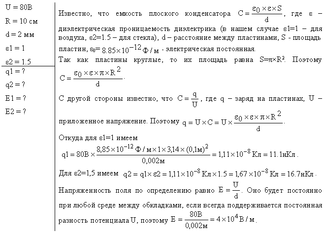 Условие задачи:Плоский конденсатор состоит из двух круглых пластин радиусом R=10 см каждая. Расстояние между пластинами d=2 мм. Конденсатор присоединен к источнику напряжения U=80 В. Определить заряд Q и напряженность E поля конденсатора в двух случаях:а) диэлектрик - воздух; б) диэлектрик - стекло.
