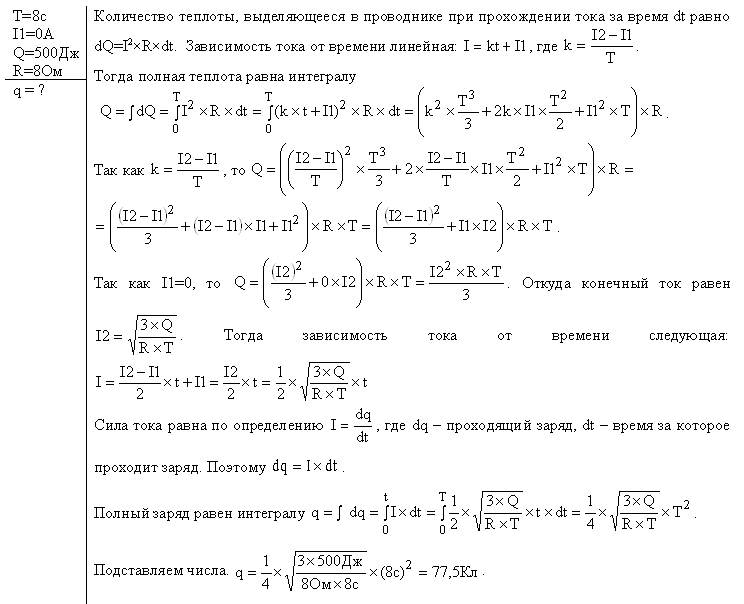 Условие задачи:За время t=8 с при равномерно возраставшей силе тока в проводнике сопротивлением R=8 Ом выделилось количество теплоты Q=500 Дж. Определить заряд q, проходящий в проводнике, если сила тока в начальный момент времени равна нулю.