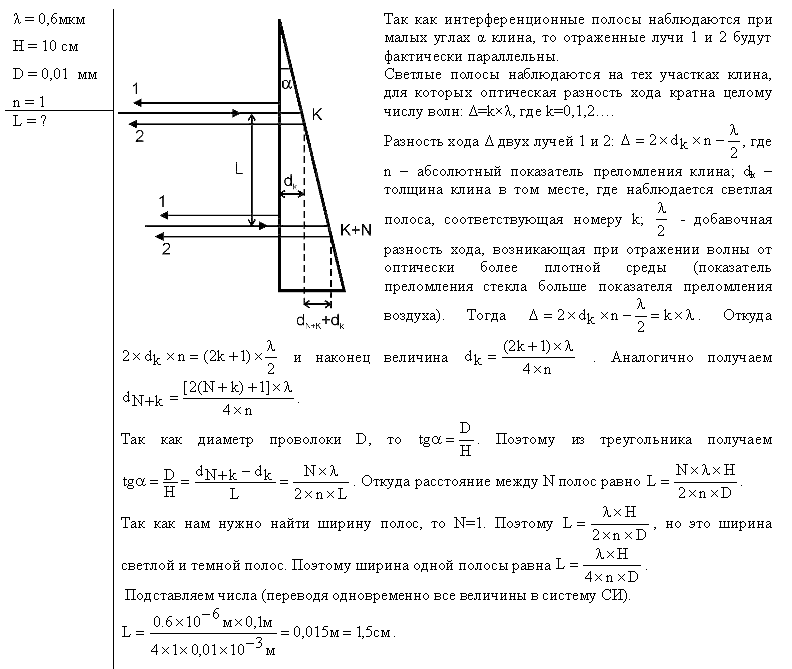 Условие задачи:Между двумя плоскопараллельными пластинами на расстоянии L=10 см от границы их соприкосновения находится проволока диаметром d=0,01 мм, образуя воздушный клин. Пластины освещаются нормально падающим монохроматическим светом (λ=0,6 мкм). Определить ширину b интерференционных полос, наблюдаемых в отраженном свете.