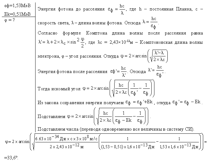 Условие задачи:Определить угол ϑ, на который был рассеян квант с энергией ε1=1,53 МэВ при эффекте Комптона, если кинетическая энергия электрона отдачи T=0,51 МэВ.