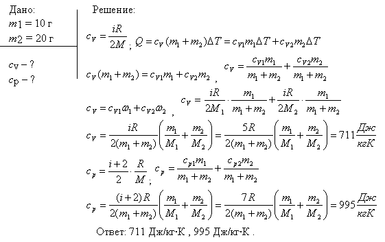 Условие задачи:Каковы удельные теплоемкости cV и cp смеси газов, содержащей кислород массой m1=10 г и азот массой m2=20 г?