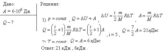 Условие задачи:Расширяясь, водород совершил работу A=6 кДж. Определить количество теплоты Q, подведенное к газу, если процесс протекал: 1) изобарно; 2) изотермически.
