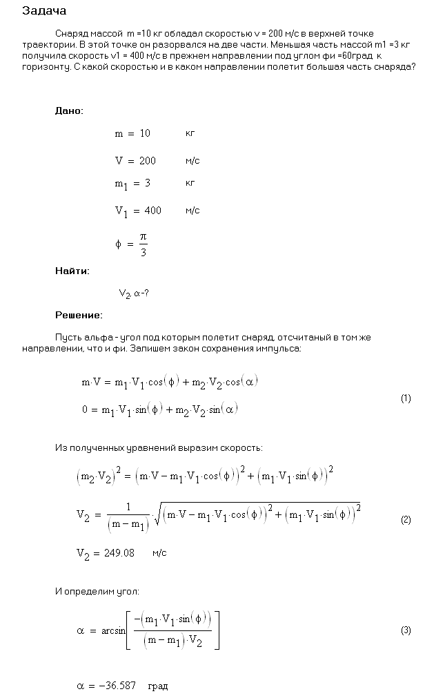 Условие задачи:В предыдущей задаче найти, с какой скоростью u2 и под каким углом φ2 к горизонту полетит большая часть снаряда, если меньшая полетела вперед под углом φ1=60° к горизонту.