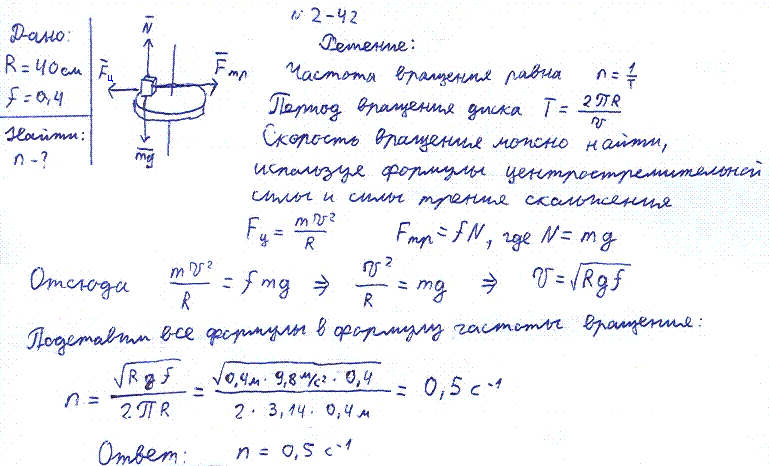 Условие задачи:Диск радиусом R=40 см вращается вокруг вертикальной оси. На краю диска лежит кубик. Принимая коэффициент трения f=0,4, найти частоту n вращения, при которой кубик соскользнет с диска.