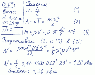 Условие задачи:Насос выбрасывает струю воды диаметром d=2 см со скоростью v=20 м/с. Найти мощность N, необходимую для выбрасывания воды.