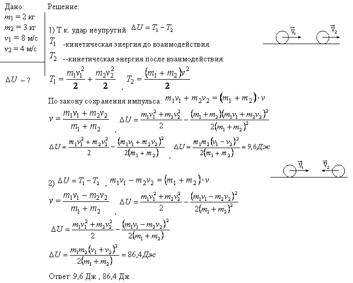 Условие задачи:Два неупругих шара массами m1=2 кг и m2=3 кг движутся со скоростями соответственно v1=8 м/с и v2=4 м/с. Определить увеличение ΔU внутренней энергии шаров при их столкновении в двух случаях:1) меньший шар нагоняет больший; 2) шары движутся навстречу друг другу.