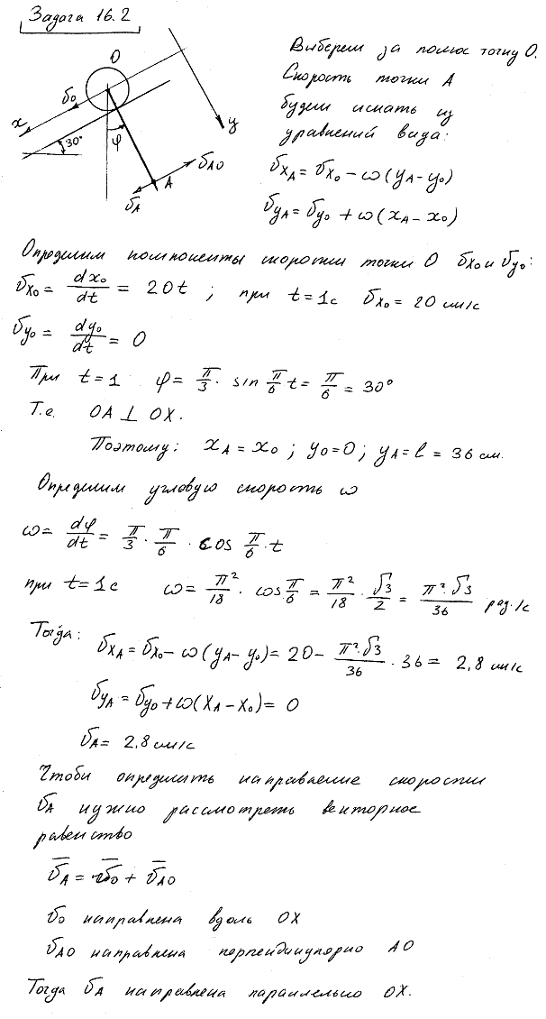 Решение задачи 16.2 из сборника Мещерского по теоретической механике(Физика → Термех → Решебник Мещерского → Плоское движение твердого тела → Скорости точек твердого тела в плоском движении. Мгновенный центр скоростей) Условие задачиКолесо катится по наклонной плоскости, образующей угол 30° с горизонтом. Центр O колеса движется по закону xO=10t2 см, где x — ось, направленная параллельно наклонной плоскости. К центру O колеса подвешен стержень OA=36 см, качающийся вокруг горизонтальной оси O, перпендикулярной плоскости рисунка, по закону φ=(π/3)sin(πt/6) рад. Найти скорость конца A стержня AO в момент времени t=1 с. |