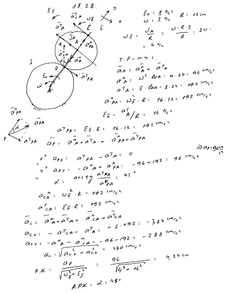 Решение задачи 18.28 из сборника Мещерского по теоретической механике(Физика → Термех → Решебник Мещерского → Плоское движение твердого тела → Ускорения точек твердого тела в плоском движении. Мгновенный центр ускорений) Условие задачиШестеренка радиуса R=12 см приводится в движение кривошипом OA, вращающимся вокруг оси O неподвижной шестеренки с тем же радиусом; кривошип вращается с угловым ускорением ε0=8 рад/с2, имея в данный момент угловую скорость ω=2 рад/с. Определить: