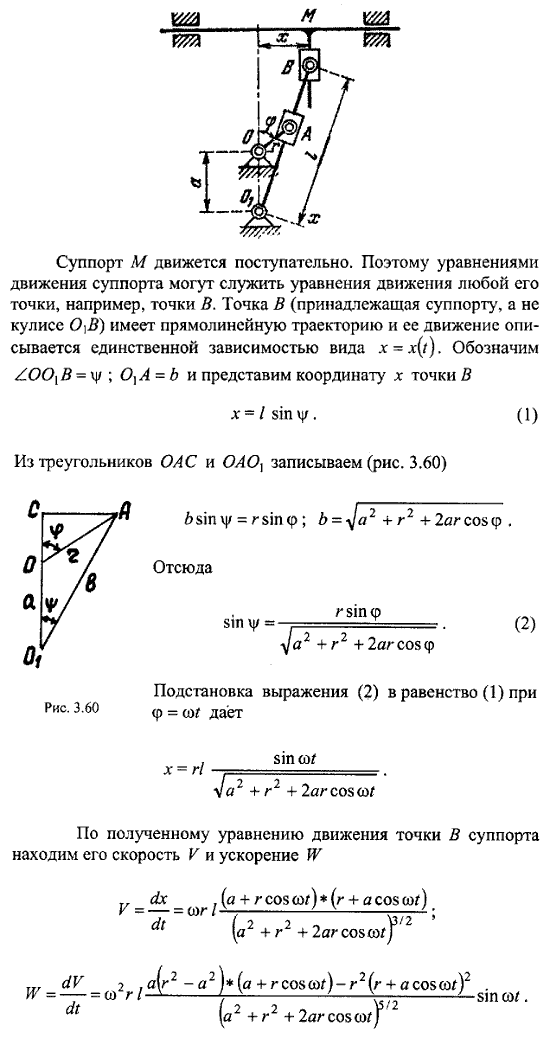 Решение задачи 23.24 из сборника Мещерского по теоретической механике(Физика → Термех → Решебник Мещерского → Сложное движение точки → Сложение ускорений точки) Условие задачиНайти уравнение движения, скорость и ускорение суппорта M строгального станка, приводимого в движение кривошипно-кулисным механизмом с качающейся кулисой O1B. Схема указана на рисунке. Кулиса соединена с суппортом M при помощи ползуна B, скользящего относительно суппорта по направляющей, перпендикулярной оси его движения. Дано: O1B=l, OA=r, O1O=a, r<a; кривошип OA вращается с постоянной угловой скоростью ω; угол поворота кривошипа отсчитывается от вертикальной оси. |