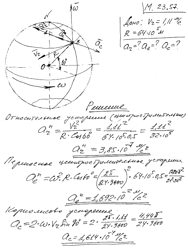 Решение задачи 23.57 из сборника Мещерского по теоретической механике(Физика → Термех → Решебник Мещерского → Сложное движение точки → Сложение ускорений точки) Условие задачиРека Нева течет с востока на запад по параллели 60° северной широты со скоростью vr=1,11 м/с. Найти составляющие абсолютного ускорения частицы воды. Радиус Земли R=64*105 м. |