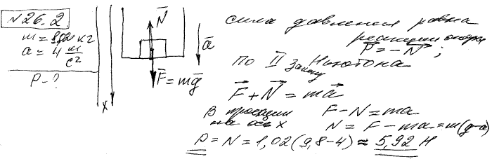 Решение задачи 26.2 из сборника Мещерского по теоретической механике(Физика → Термех → Решебник Мещерского → Динамика материальной точки → Определение сил по заданному движению) Условие задачиГоризонтальная платформа, на которой лежит груз массы 1,02 кг, опускается вертикально вниз с ускорением 4 м/с2. Найти силу давления, производимого грузом на платформу во время их совместного спуска. |