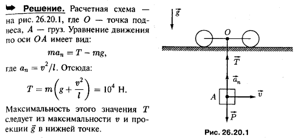 Решение задачи 26.20 из сборника Мещерского по теоретической механике(Физика → Термех → Решебник Мещерского → Динамика материальной точки → Определение сил по заданному движению) Условие задачиГруз массы 1000 кг перемещается вместе с тележкой вдоль горизонтальной фермы мостового крана со скоростью v=1 м/с. Расстояние центра тяжести груза до точки подвеса l=5 м. При внезапной остановке тележки груз по инерции будет продолжать движение и начнет качаться около точки подвеса. Определить наибольшее натяжение каната при качании груза. |
