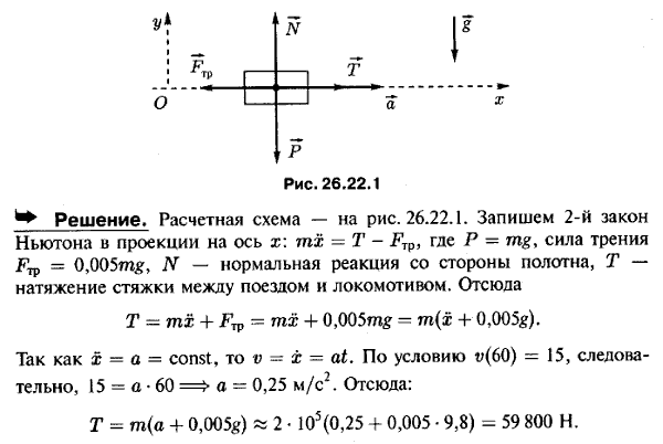 Решение задачи 26.22 из сборника Мещерского по теоретической механике(Физика → Термех → Решебник Мещерского → Динамика материальной точки → Определение сил по заданному движению) Условие задачиМасса поезда без локомотива равна 2*105 кг. Двигаясь по горизонтальному пути равноускоренно, поезд через 60 с после начала движения приобрел скорость 15 м/с. Сила трения равна 0,005 веса поезда. Определить натяжение стяжки между поездом и локомотивом в период разгона. |
