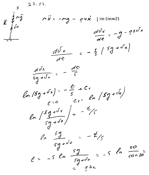 Решение задачи 27.17 из сборника Мещерского по теоретической механике(Физика → Термех → Решебник Мещерского → Динамика материальной точки → Дифференциальные уравнения движения) Условие задачиТело массы 2 кг, брошенное вертикально вверх со скоростью 20 м/с, испытывает сопротивление воздуха, которое при скорости v м/с равно 0,4v Н. Найти, через сколько секунд тело достигнет наивысшего положения. |