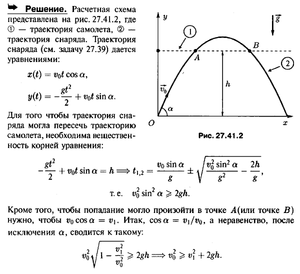Решение задачи 27.41 из сборника Мещерского по теоретической механике(Физика → Термех → Решебник Мещерского → Динамика материальной точки → Дифференциальные уравнения движения) Условие задачиСамолет A летит над землей на высоте h с горизонтальной скоростью v1. Из орудия B произведен выстрел по самолету в тот момент, когда самолет находится на одной вертикали с орудием. Найти: 1) какому условию должна удовлетворять начальная скорость v0 снаряда для того, чтобы он мог попасть в самолет, и 2) под каким углом α к горизонту должен быть сделан выстрел. Сопротивлением воздуха пренебречь. |