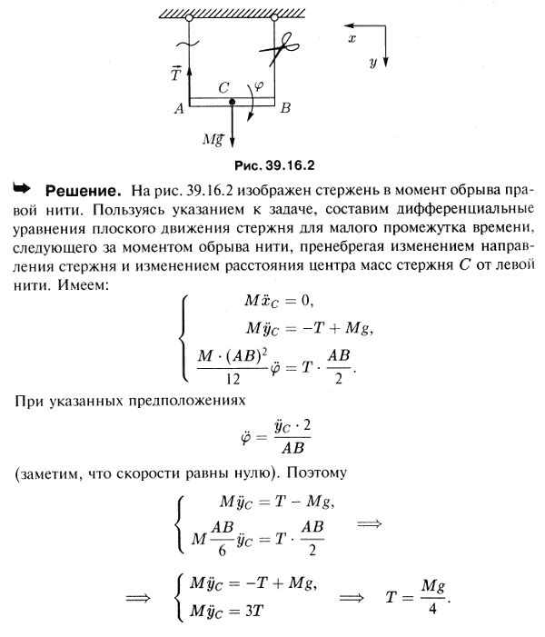 Решение задачи 39.16 из сборника Мещерского по теоретической механике(Физика → Термех → Решебник Мещерского → Динамика материальной системы → Плоскопараллельное (плоское) движение твердого тела) Условие задачиОднородный стержень AB массы M горизонтально подвешен к потолку посредством двух вертикальных нитей, прикрепленных к концам стержня. Найти натяжение одной из нитей в момент обрыва другой. Указание. Составить дифференциальные уравнения движения стержня для весьма малого промежутка времени, следующего за моментом обрыва нити, пренебрегая изменением направления стержня и изменением расстояния центра масс стержня от другой нити. |
