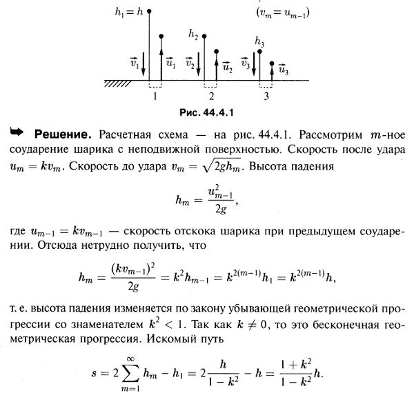 Решение задачи 44.4 из сборника Мещерского по теоретической механике(Физика → Термех → Решебник Мещерского → Динамика материальной системы → Удар) Условие задачиУпругий шарик падает по вертикали с высоты h на горизонтальную плиту, отскакивает от нее вверх, вновь падает на плиту и т.д., продолжая эти движения. Найти путь, пройденный шариком до остановки, если коэффициент восстановления при ударе равен k. |
