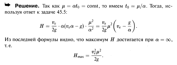 Решение задачи 45.6 из сборника Мещерского по теоретической механике(Физика → Термех → Решебник Мещерского → Динамика материальной системы → Динамика точки и системы переменной массы (переменного состава)) Условие задачиПри условиях предыдущей задачи определить значение α, отвечающее максимальной возможной высоте подъема ракеты Hmax, и вычислить Hmax (величину μ=αt0=ln(m0/m1) необходимо считать постоянной; m1 — масса ракеты в момент t0). |