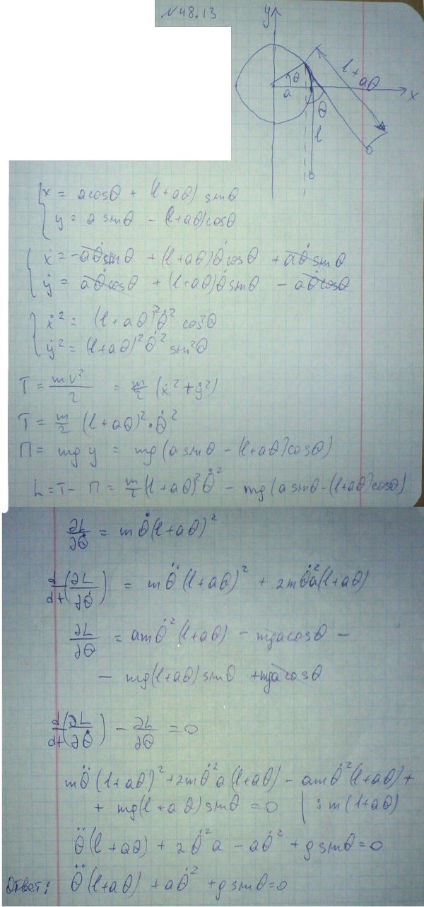 Решение задачи 48.13 из сборника Мещерского по теоретической механике(Физика → Термех → Решебник Мещерского → Аналитическая механика → Уравнения Лагранжа 2-го рода) Условие задачиСоставить уравнение движения маятника, состоящего из материальной точки M массы m, подвешенной на нити, навернутой на неподвижный цилиндр радиуса a. Длина свисающей в положении равновесия части нити равна l. Массой нити пренебречь. |