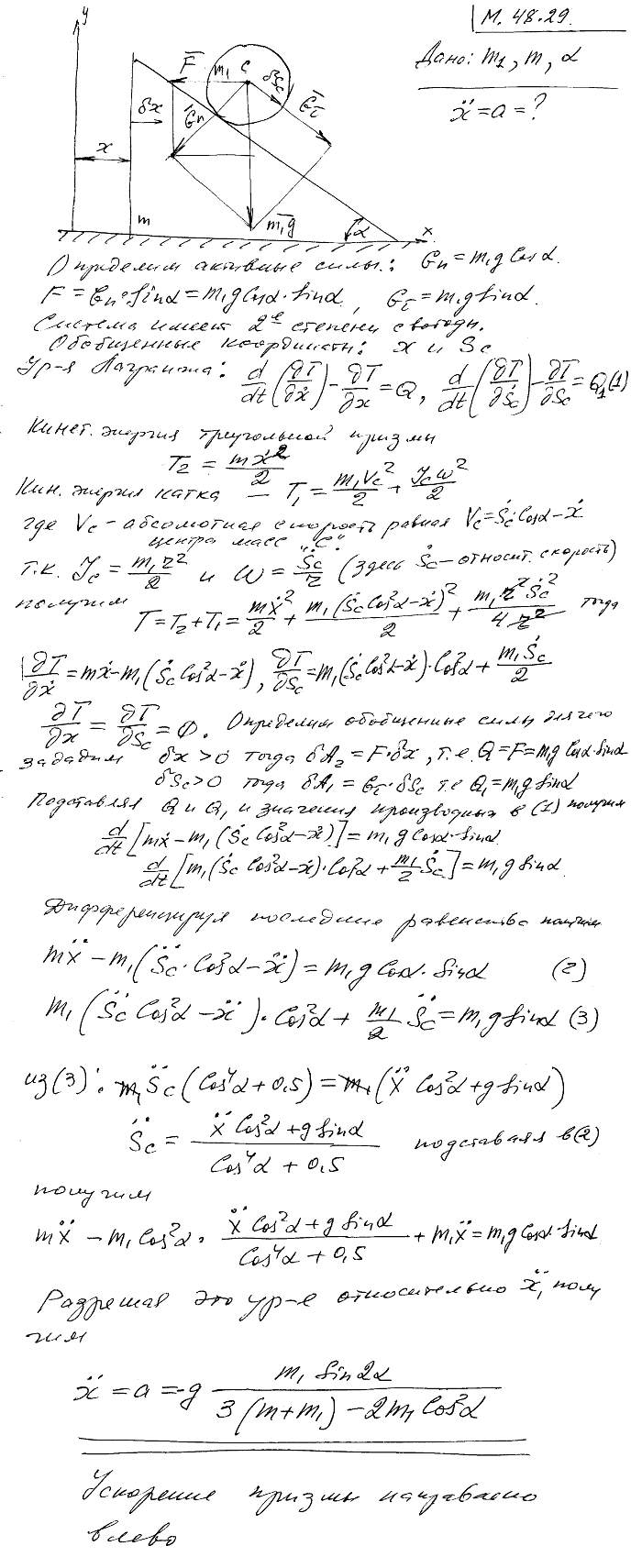 Решение задачи 48.29 из сборника Мещерского по теоретической механике(Физика → Термех → Решебник Мещерского → Аналитическая механика → Уравнения Лагранжа 2-го рода) Условие задачиНа гладкой горизонтальной плоскости помещена треугольная призма ABC массы m, которая может скользить без трения по этой плоскости; по грани призмы AB катится без скольжения однородный круглый цилиндр массы m1. Определить ускорение призмы. |