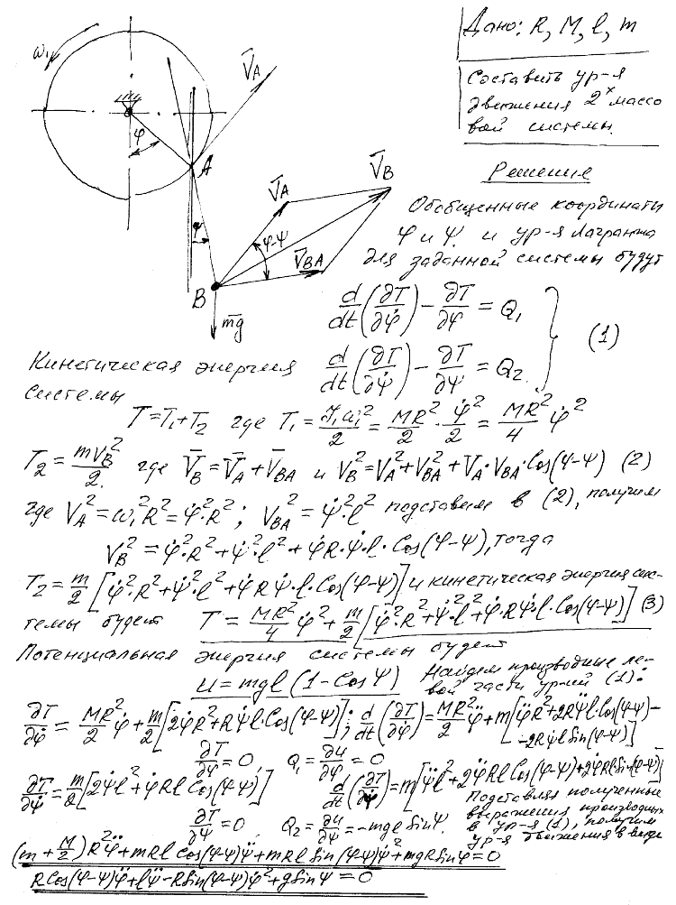 Решение задачи 48.41 из сборника Мещерского по теоретической механике(Физика → Термех → Решебник Мещерского → Аналитическая механика → Уравнения Лагранжа 2-го рода) Условие задачиОднородный диск радиуса R, имеющий массу M, может вращаться вокруг своей горизонтальной оси O. К диску на нити AB длины l подвешена материальная точка массы m. Составить уравнения движения системы. |