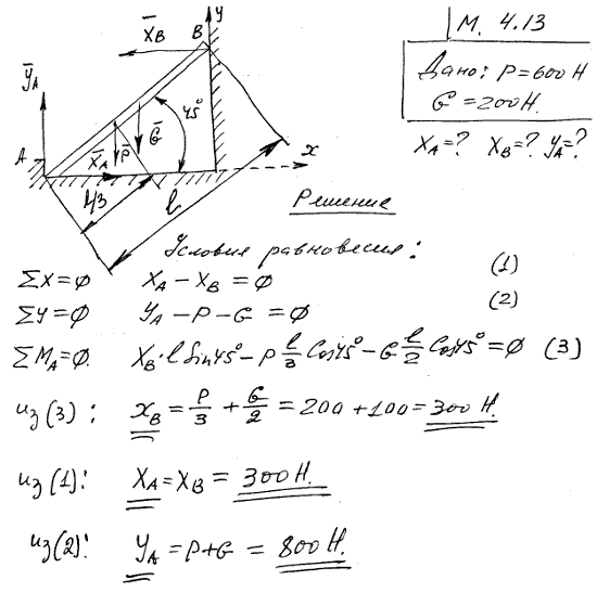 Решение задачи 4.13 из сборника Мещерского по теоретической механике(Физика → Термех → Решебник Мещерского → Плоская система сил → Произвольная плоская система сил) Условие задачиК гладкой стене прислонена однородная лестница AB под углом 45° к горизонту; вес лестницы 200 Н; в точке D на расстоянии, равном 1/3 длины лестницы, от нижнего конца находится человек веса 600 Н. Найти силы давления лестницы на опору A и на стену. |