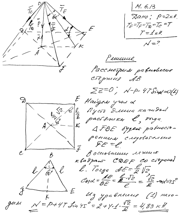 Решение задачи 6.13 из сборника Мещерского по теоретической механике(Физика → Термех → Решебник Мещерского → Пространственная система сил → Силы, линии действия которых пересекаются в одной точке) Условие задачиМачта AB удерживается в вертикальном положении посредством четырех симметрично расположенных оттяжек. Угол между каждыми двумя смежными оттяжками равен 60°. Определить давление мачты на землю, если натяжение каждой из оттяжек равно 1 кН, а вес мачты 2 кН. |