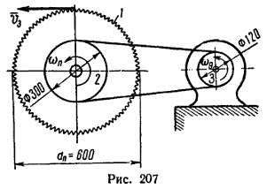Шкивы 2 и 3 соединены бесконечным ремнем. Полагая, что ремень не растягивается и не проскальзывает на шкивах, можно считать, что все его точки движутся с одной и той же скоростью vр. Это означает, что скорости точек, расположенных на поверхностях обоих шкивов, одинаковы и равны vр.