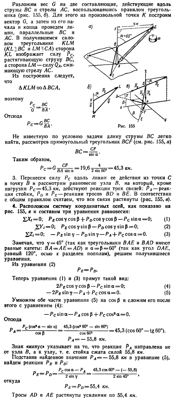 1. В задаче рассматривается равновесие системы тел – стрелы и стойки, связанных струной ВС. Прежде чем приступить к определению усилий в стойке и тросах, необходимо найти натяжение струны ВС.