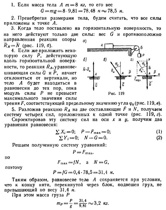 Равновесие с учетом сил трения(Физика → Теоретическая механика → Произвольная плоская система сил → Задача 89) Условие задачиТело А массой 8 кг поставлено на шероховатую горизонтальную поверхность стола. К телу привязана нить, перекинутая через блок Б (рис. 119, а). Какой груз Р можно подвязать к концу нити, свешивающейся с блока, чтобы не нарушить равновесия тела А? Коэффициент трения f=0,4. Трением на блоке пренебречь. |