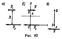 Равнодействующая заданных сил численно равна 48 н, направлена влево, и линия ее действия лежит ниже точки О на 0,25 м (рис. 82, в).