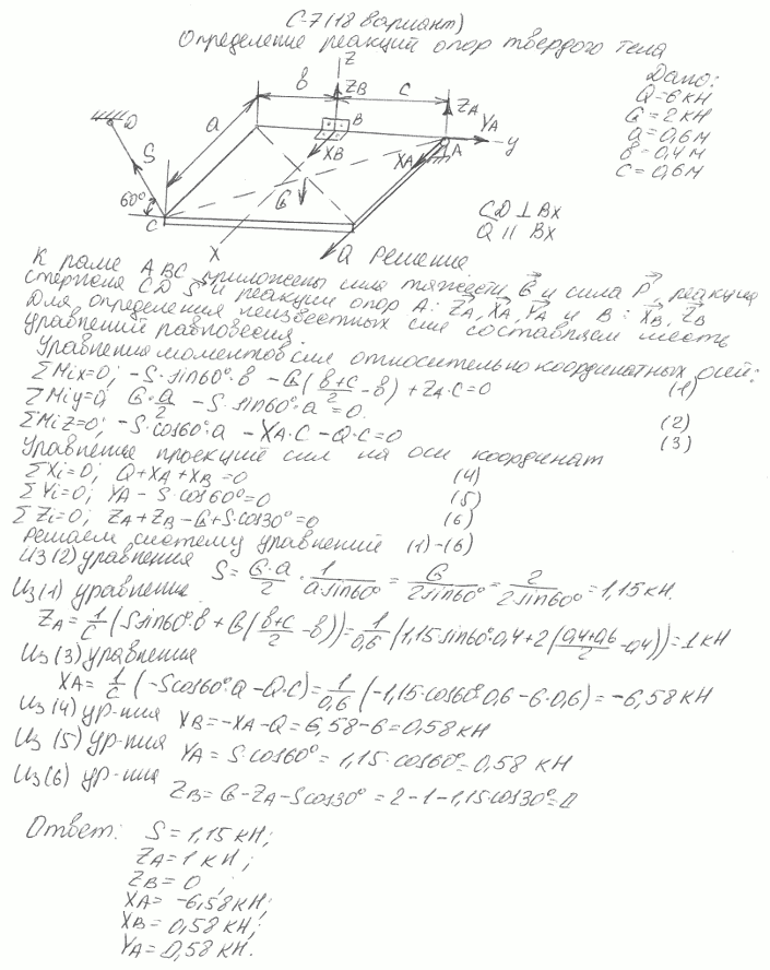 Задание С.7. Определение реакций опор твердого тела (к условию задания)